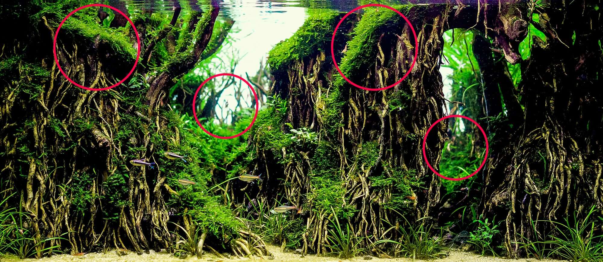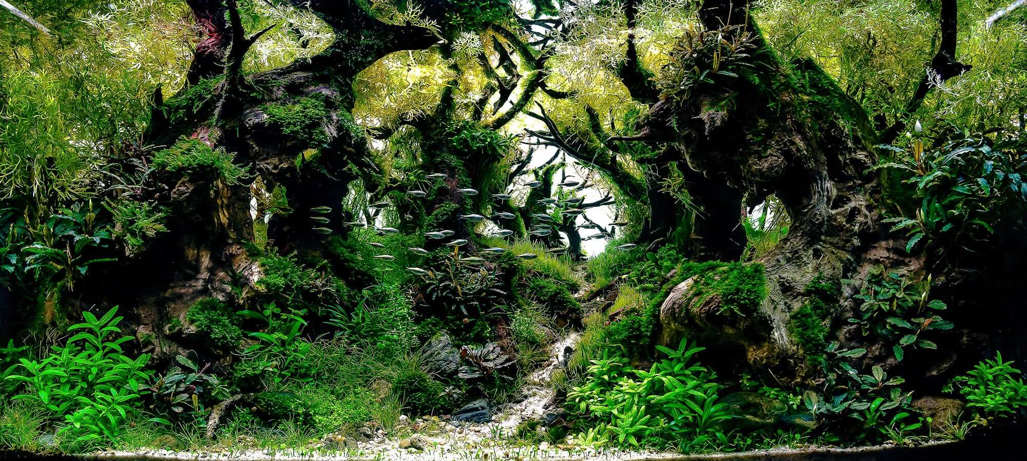 Driftwood is the main ingredient when creating a rainforest scene in your tank. Straight or wavy pieces of wood are carefully intertwined with plants, generating amazing details. Aquatic moss is heavily used here along with other small to medium plants like Anubias, Bucephalandra and Cryptocoryne.