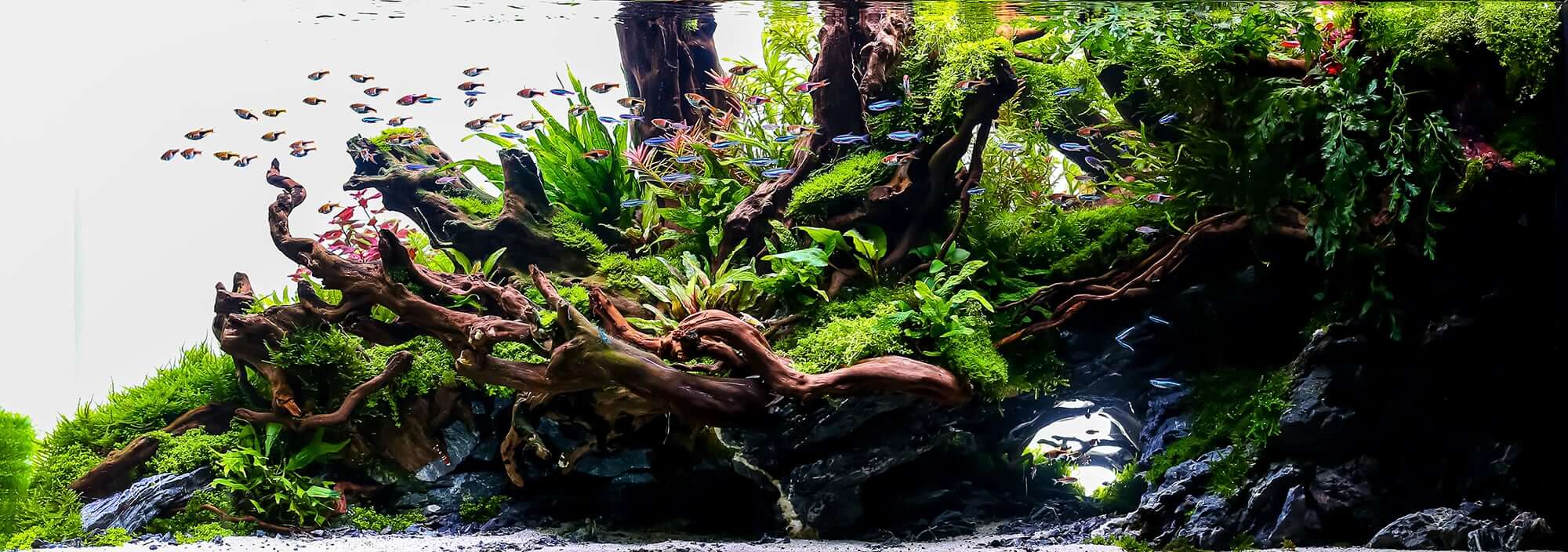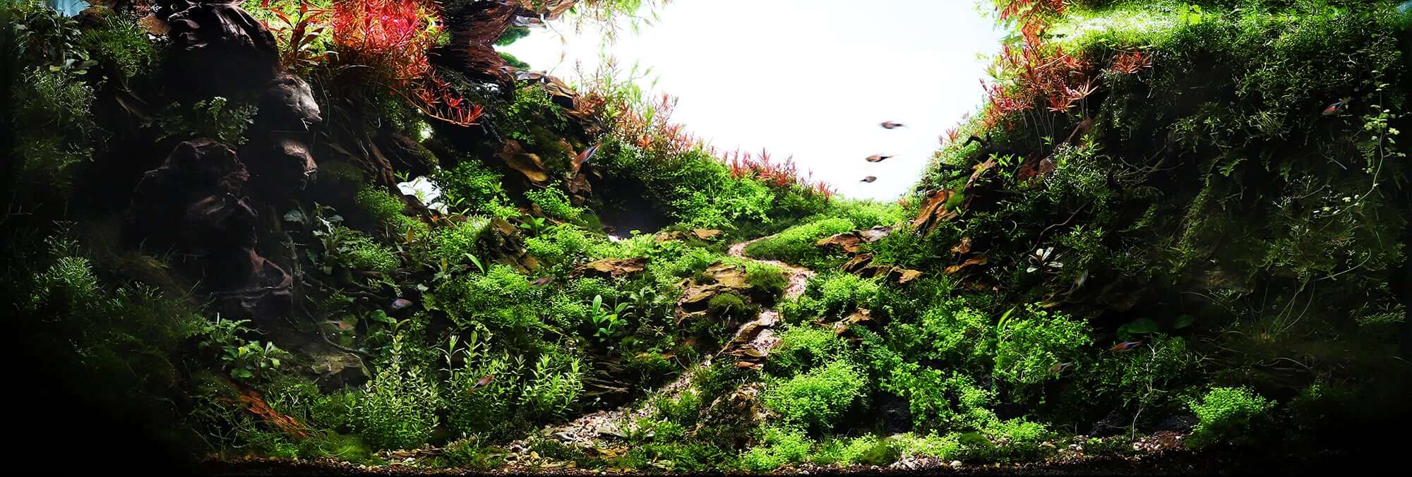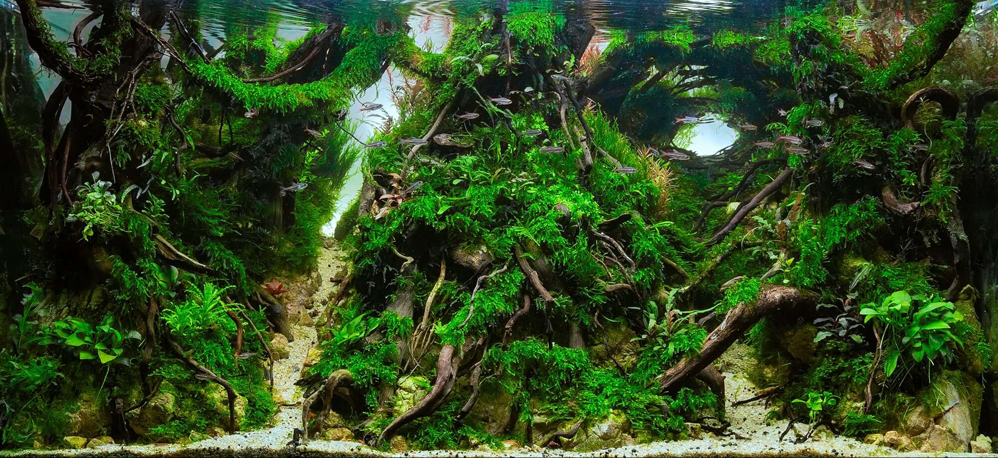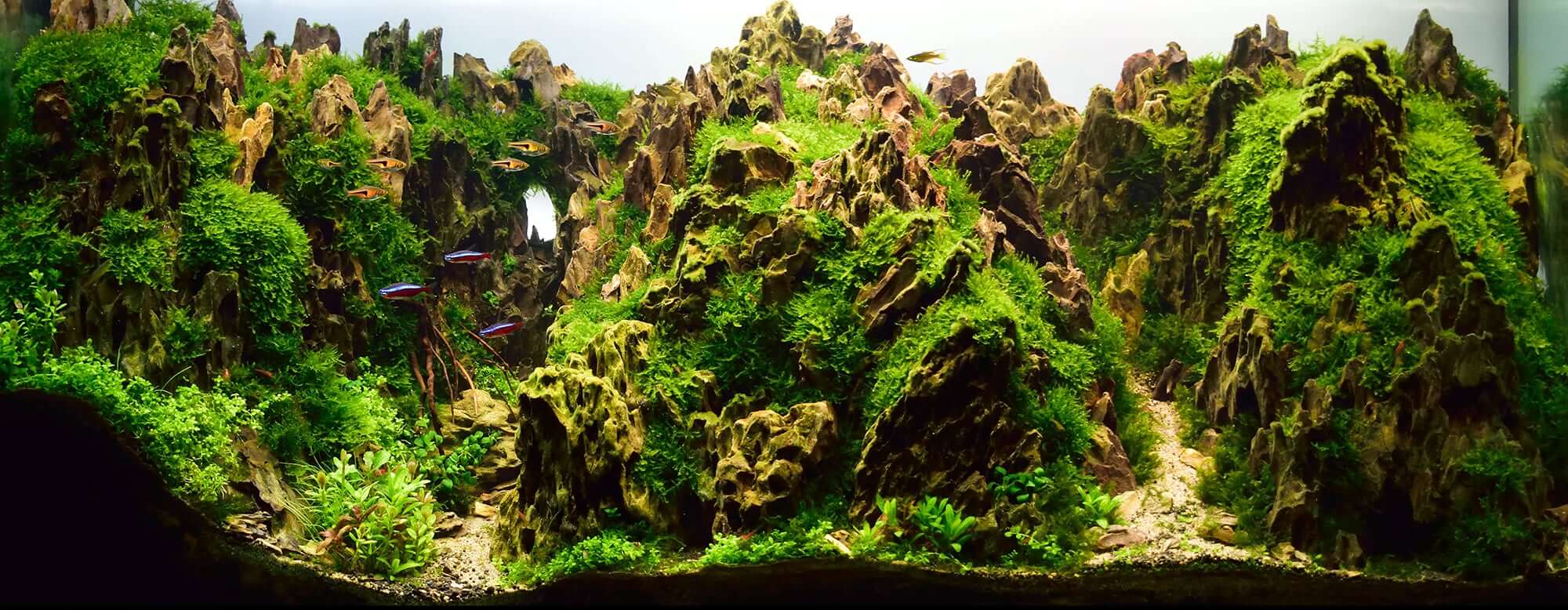 This aquascaping style is characterized by attention to the alignment and grouping of hardscape. Rocks and driftwood are mixed with aquatic plants in order to create an underwater replica of a particular terrestrial landscape. Mountains, rainforests, lush green hillsides, valleys and even beaches are re-imagined inside the Nature Aquarium.