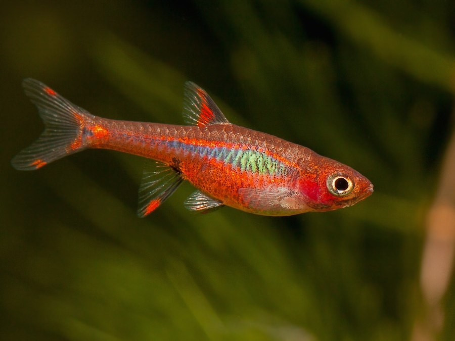 With its distinctive colors and pattern, the Mosquito rasbora displays an orange-red body color with a brown-black mid lateral stripe and a dark spot at the base of the caudal fin.