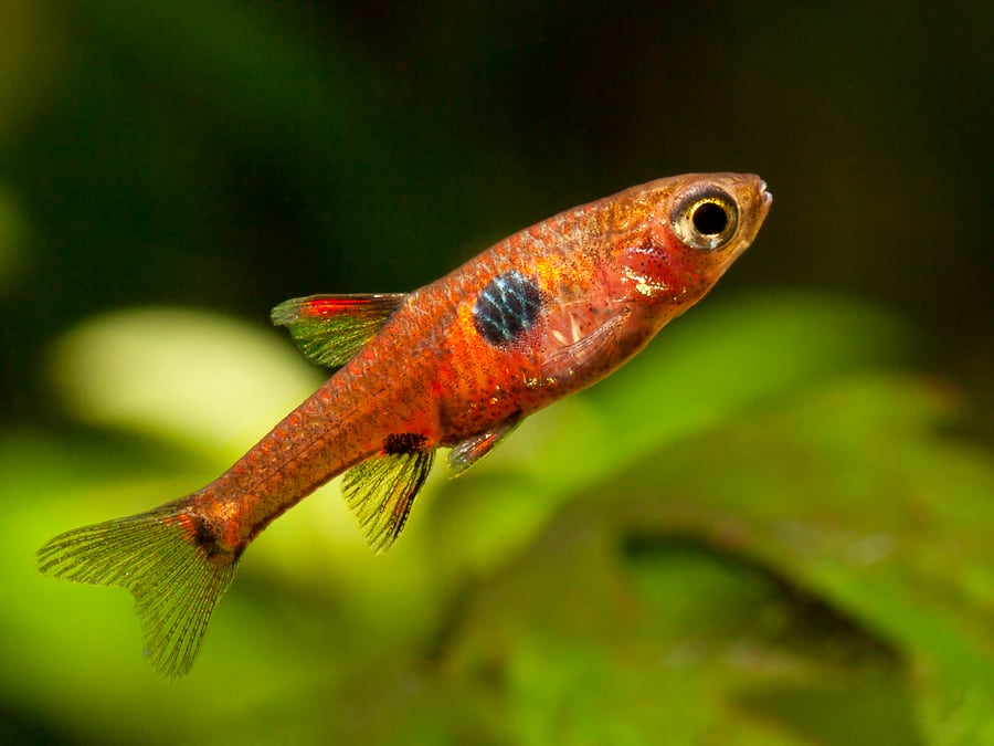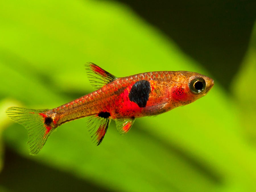 Easily distinguishable by the large black spot situated in the center of the body, and two smaller dark dots, one at the base of the caudal fin and the other at its tails base. If you give it optimal diet and care, many males of this species will display bright ruby red coloration.